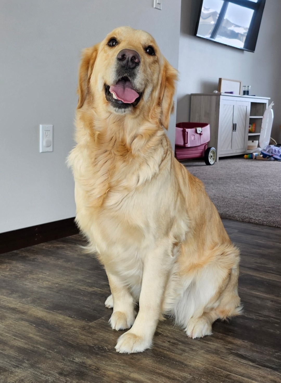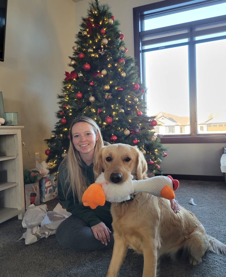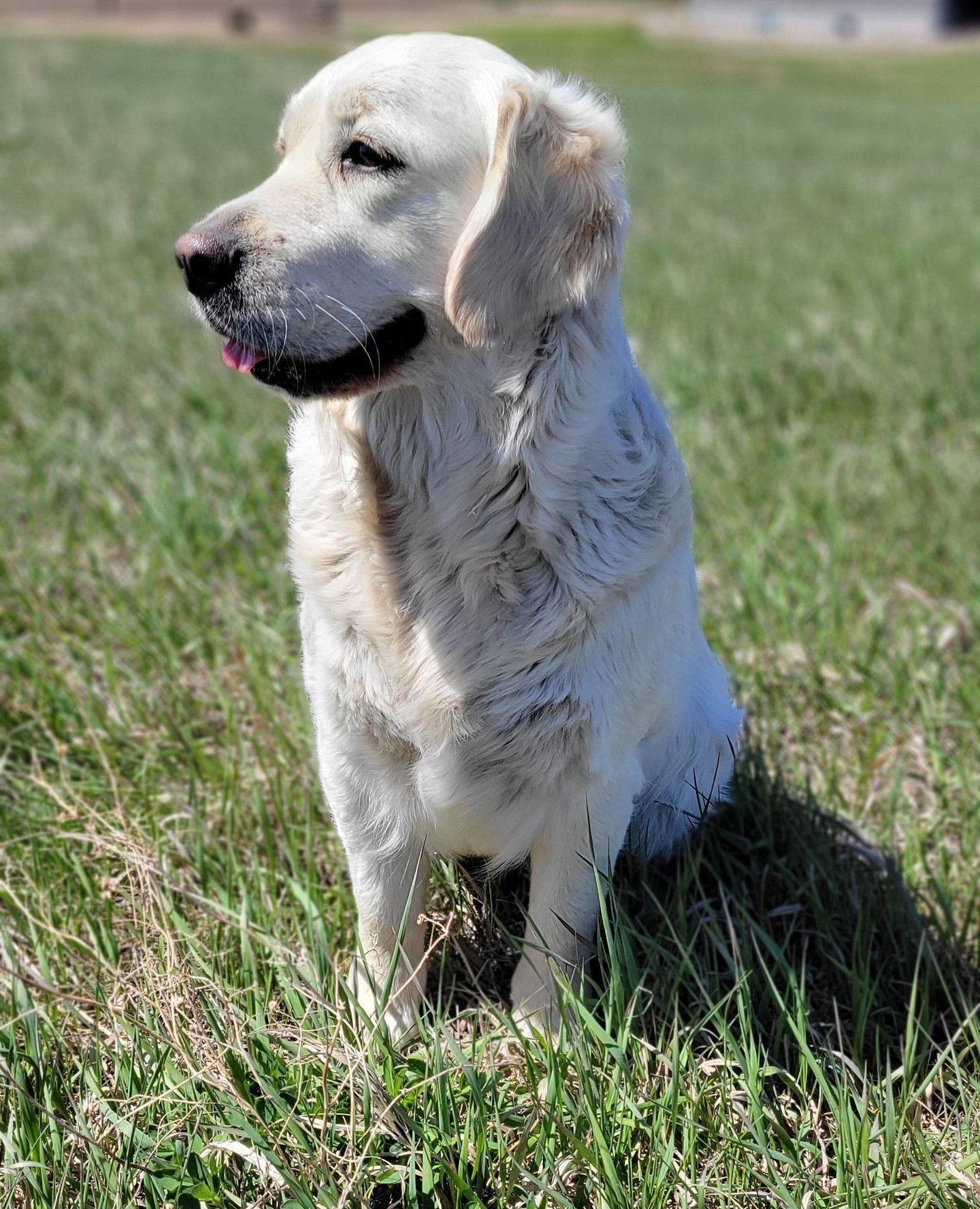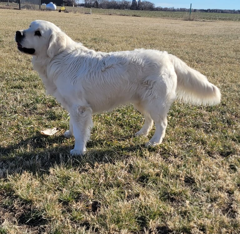 Our goofball! Willow is by far our silliest dog. Her favorite activities include tug, tug, and more tug! She loves exploring. However, she doesn't venture too far away from us. She is a sweet girl who loves people of all ages. Willow is an English Cream Golden Retriever with a beautiful white coat.
