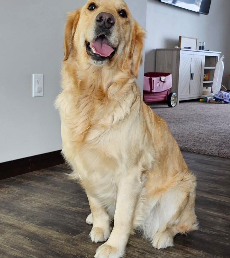 Named after the famous Leia from Star Wars. She is our sweetest dog. Although she weighs 60 pounds, she thinks she is a lap dog! Her favorite activities include getting pet, fetch, and wrestling with our other dog Rey. Leia is 50% English Cream Golden Retriever and 50% American Golden Retriever - This gives her a lighter golden coat which we think is beautiful!